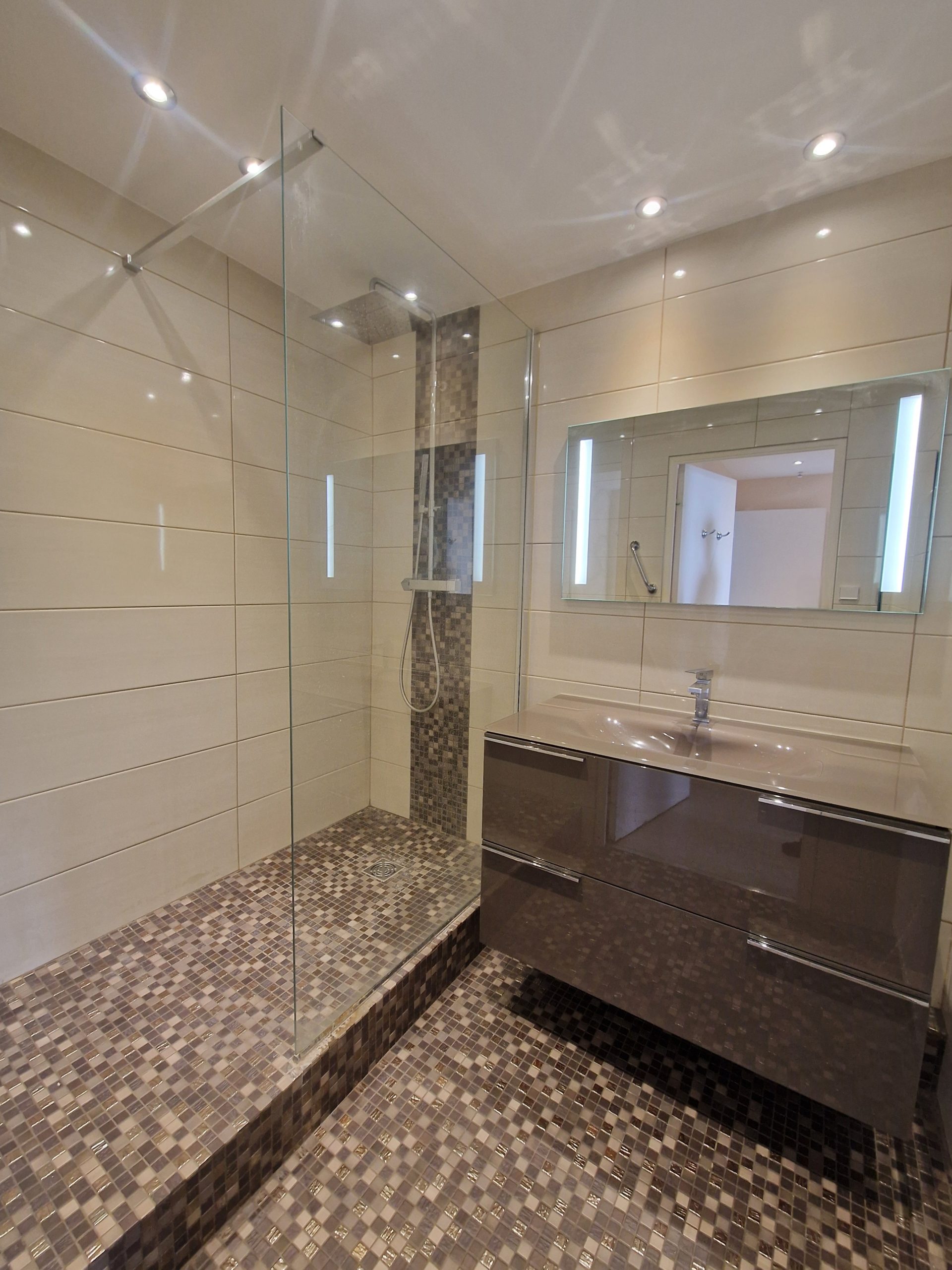 – Une salle de bain principale avec douche grand format et meuble vasque.